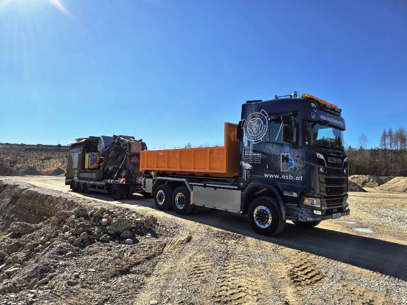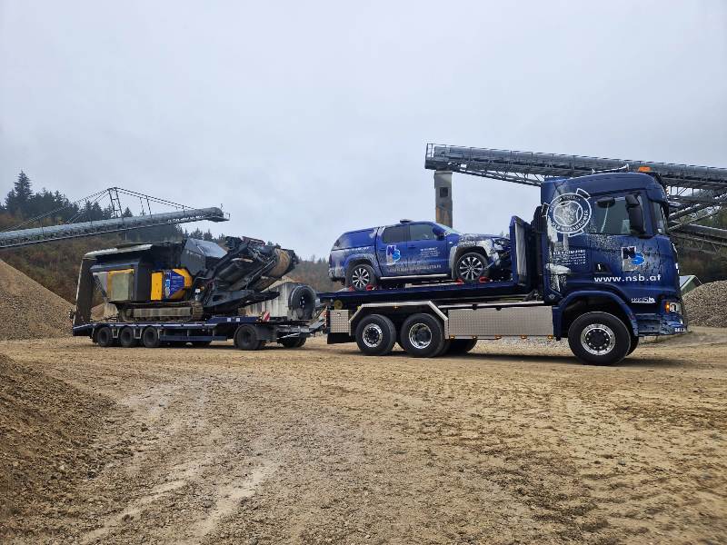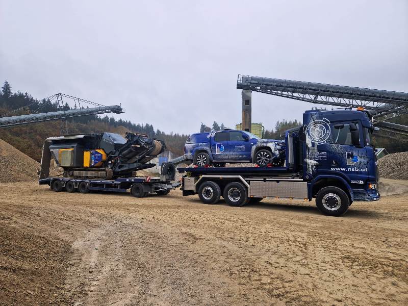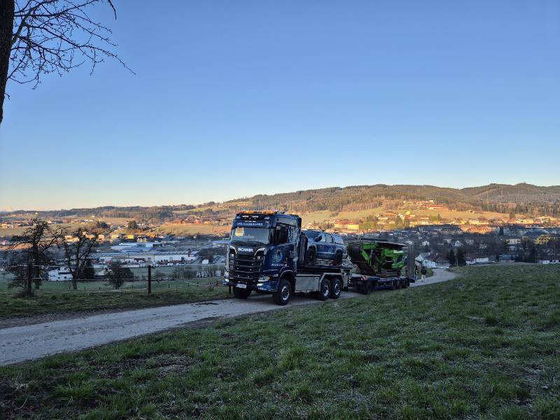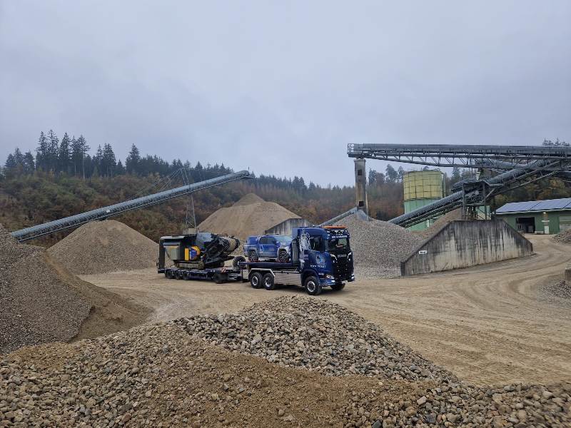 Im Morgengrauen erscheinen unsere LKW`s mit 3- und 4- Achs-Tiefladeanhänger samt Brechanlage,
